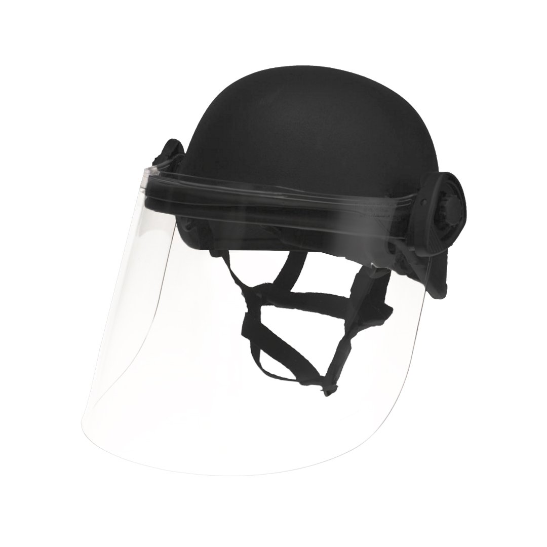 Paulson™ DK5-H.150, field-mount riot face shield designed to fit most PASGT combat helmets with front-brim (not including helmets with rails). Integral rubber seal provides protection from liquids. Optically correct lens. Shield locks into the stowed or deployed positions and can be released with one hand. 4 mm shield thickness. Shield length of 8 inches.