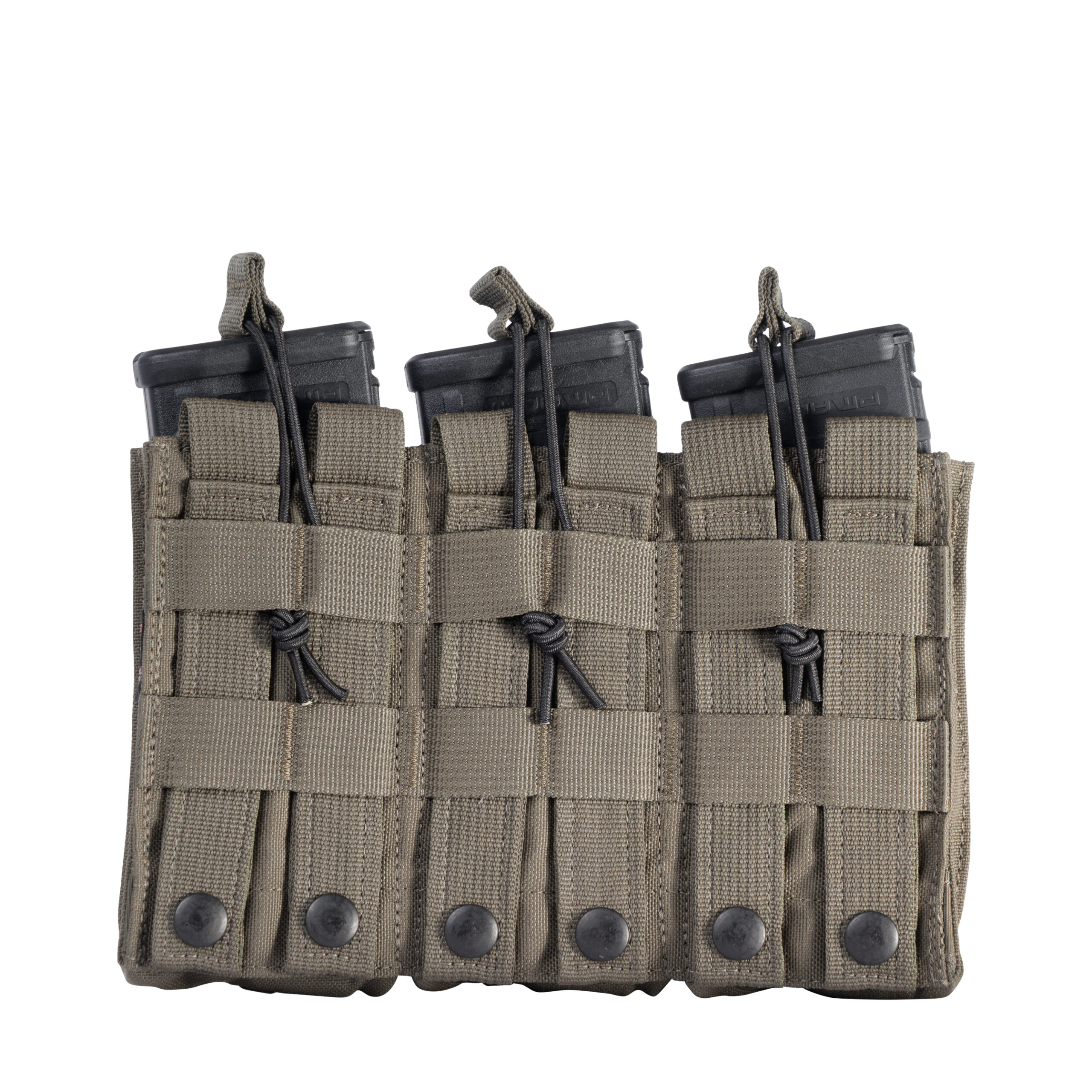 Scorpion Triple Open Top M4 Kangaroo Pouch is constructed of 1000D Nylon Cordura and can be attached to any of our MOLLE compatible carriers keeping 3 M4 mags and 3 pistol mags secure, close, and easily accessible.