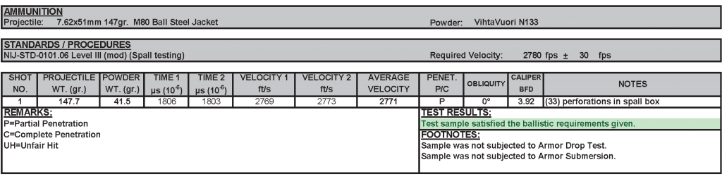 All testing was performed by Oregon Ballistic Laboratories (OBL) an NVLAP Accredited Independent Laboratory.